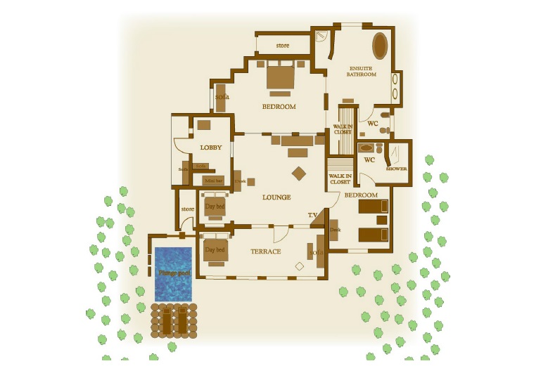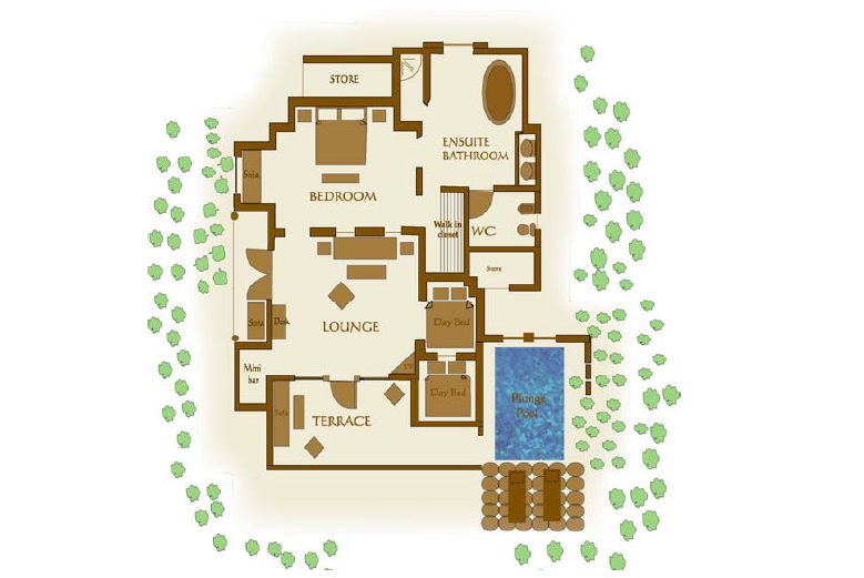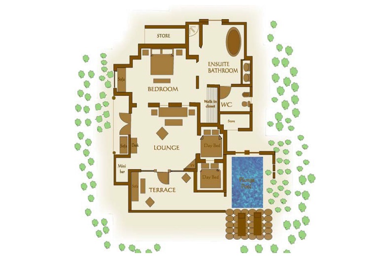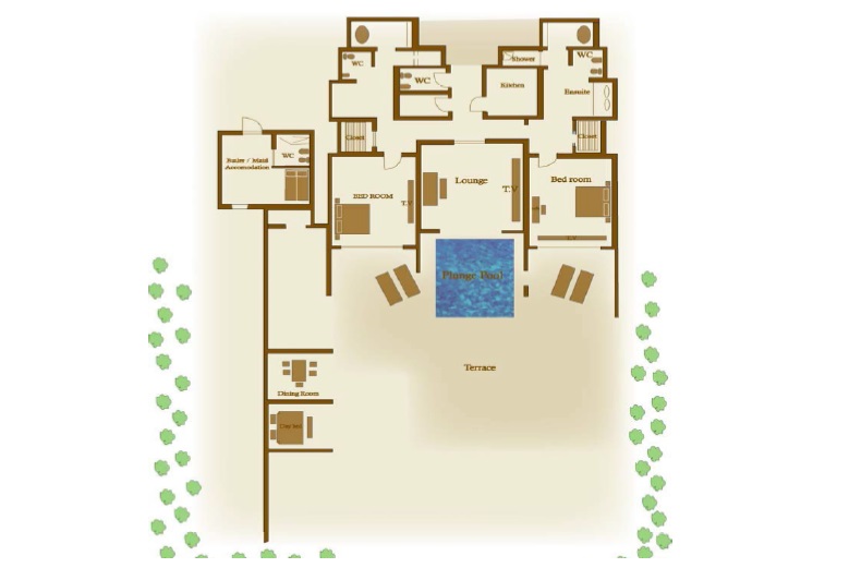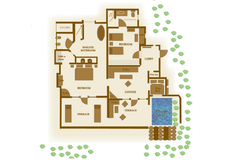 148 sq meters - Master bedroom with en suite bathroom and freestanding bathtub, walk in dressing room, living room, TV, DVD Player, Sultans Lounge Bed, mini bar area with tea/coffee making facilities, large terrace, two sun loungers and plunge pool. large terrace, two sun loungers and plunge pool.